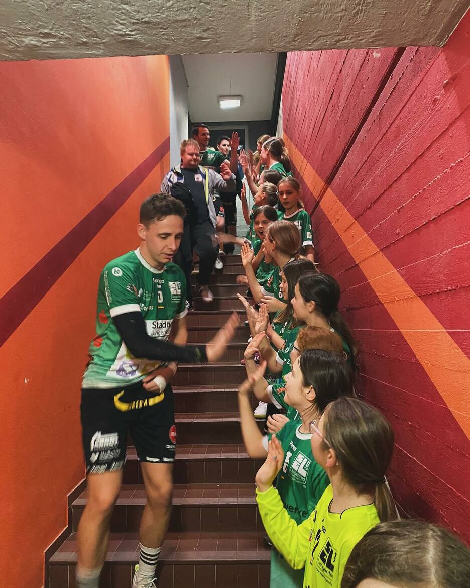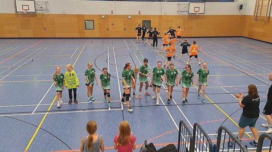 Am Freitagabend durften die Spielerinnen der weiblichen E- und D-Jugend der SGL die ersten Herren beim Einlaufen in die heimische KAG-Halle begleiten. Bei gut gefüllter Tribüne und bester Stimmung war das ein beeindruckendes Erlebnis für die Mädels. Durch ihren Support während des Spiels konnten diese dann vielleicht auch ein bisschen zum wichtigen und hart erkämpften 33:31 Heimsieg im Abstiegskampf beitragen!)