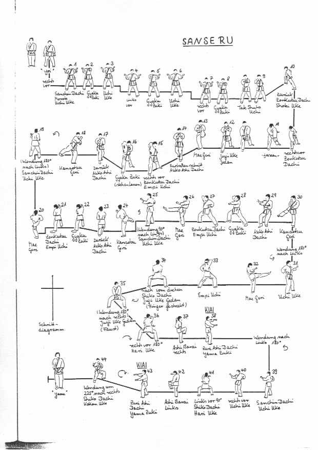 Sanseru ist eine Kaishu Kata aus der Südschule Chinas (Pakuan Shuan). Auch diese Kata wurde von Higashionna aus China mitgebracht.