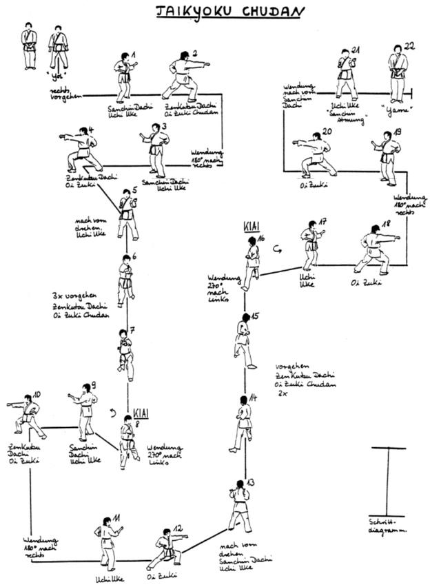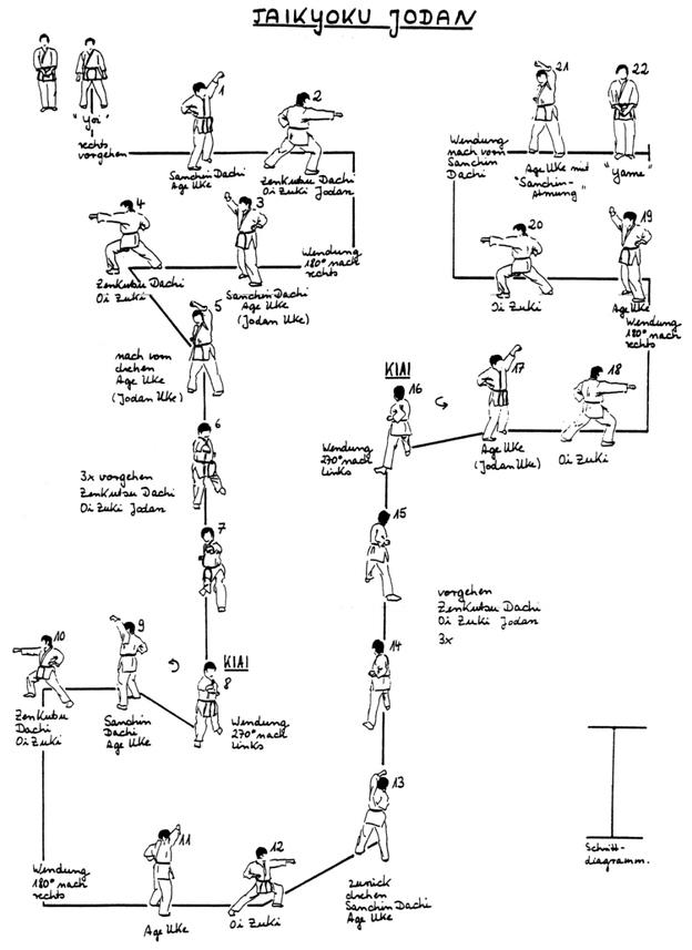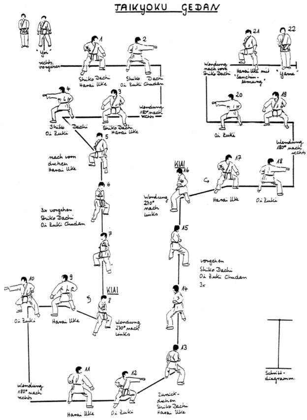 Die Taikyoku Katas unterscheiden sich in der Angriffshöhe und den Kampfstellungen, das Embusen (Schrittdiagramm) verändert sich nicht.