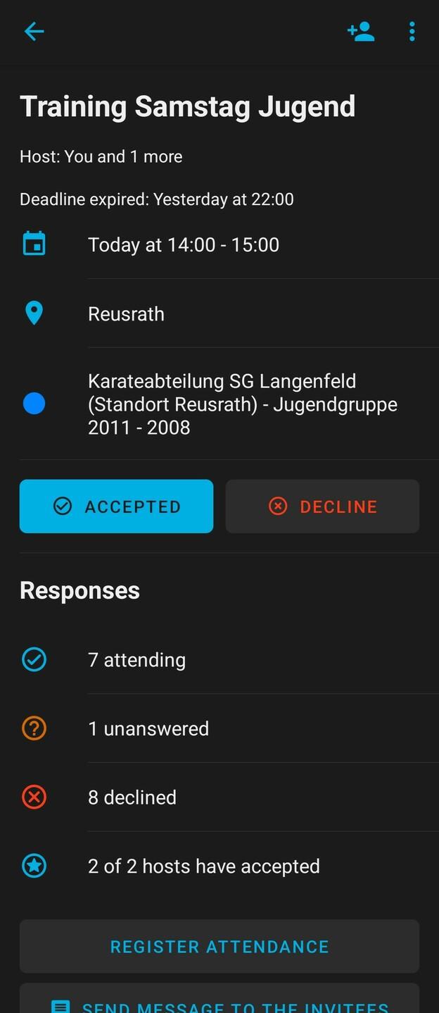 Mit den zwei großen Buttons kannst du Zu- und Absagen. Bitte sag immer rechtzeitig zu, wenn dein Kind zum Training kommt und ab, wenn dein Kind es leider nicht schafft.