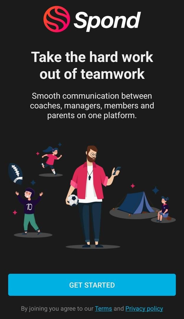 In etwa so wird Spond bei dir aussehen, wenn du die App öffnest. Klicke einfach auf "Get Started", oder was auch immer bei dir in diesem Button steht.