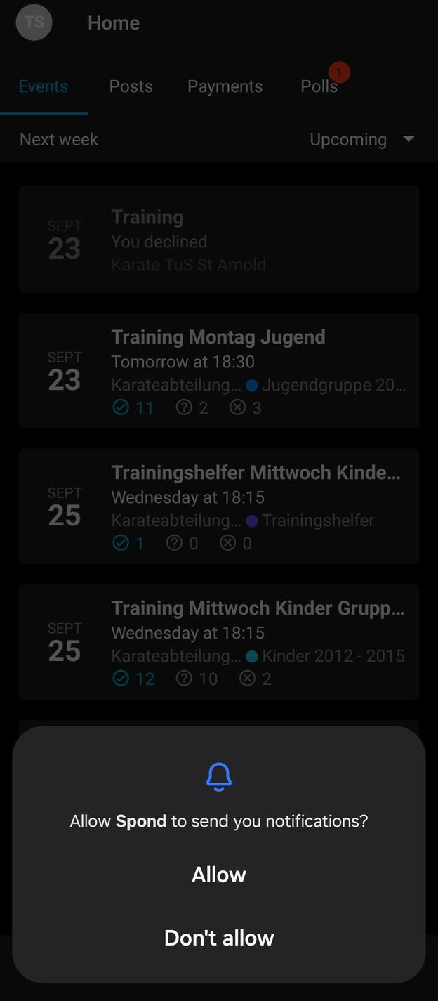 Spond wird dich jetzt vermutlich fragen, ob Push-Benachrichtigungen gesendet werden dürfen. Bitte erlaube das, damit du immer Up-to-Date bleibst.