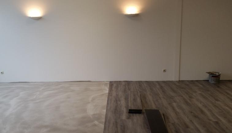 ...am Boden. Derselbe Ruheraum - leer und mit neuem Grund. So sieht er also aus, der neue Boden, der sich bald durch´s ganze Bewegungszentrum ziehen wird. Sobald der Ruheraum fertig ist, wird die neuentstandene Damenumkleide in unmittelbarer Nachbarschaft ausgestattet. So können dann auch hier schon bald die neuen Schränke Einzug halten und es geht merklich weiter.
