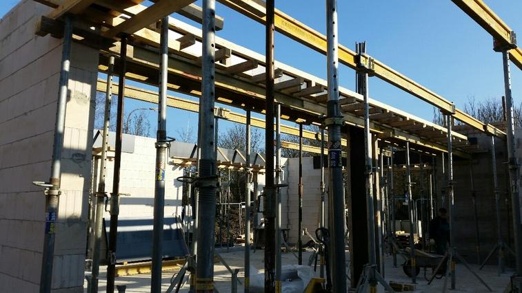 Hier entsteht die Stützkonstruktion - ja, man ist geneigt von einem wahren Stützenwald zu sprechen - für die zukünftige Zwischendecke. Da ja auch oben trainiert werden soll, muss sie einiges aushalten. Dass es dafür entsprechende Tragekonstruktionen aus Stahl und Holz braucht, verstehen wir :-) und freuen uns zusammen mit den Arbeitern über das Kaiserwetter und das Werden unseres Anbaus!