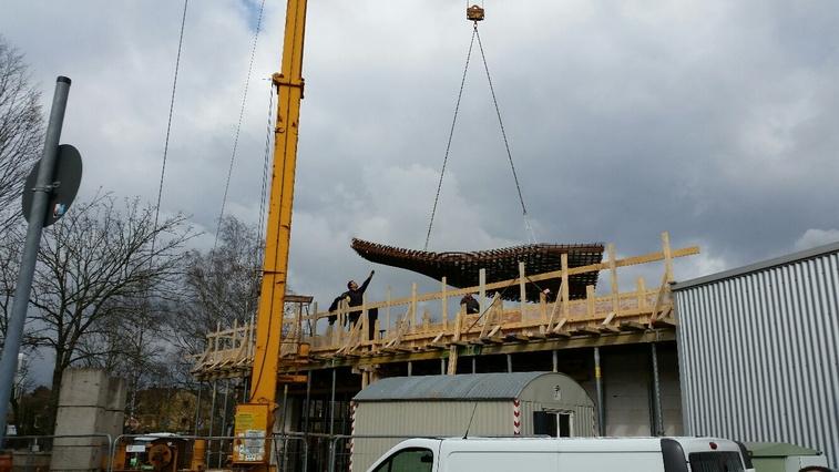 schweben heute mithilfe eines Autokrans die Deckenplatten heran. Auf der Unterkonstruktion angekommen, werden sie eingelassen und verankert, bevor in der nächsten Woche nochmals eine gegossene Deckenschicht folgen wird.