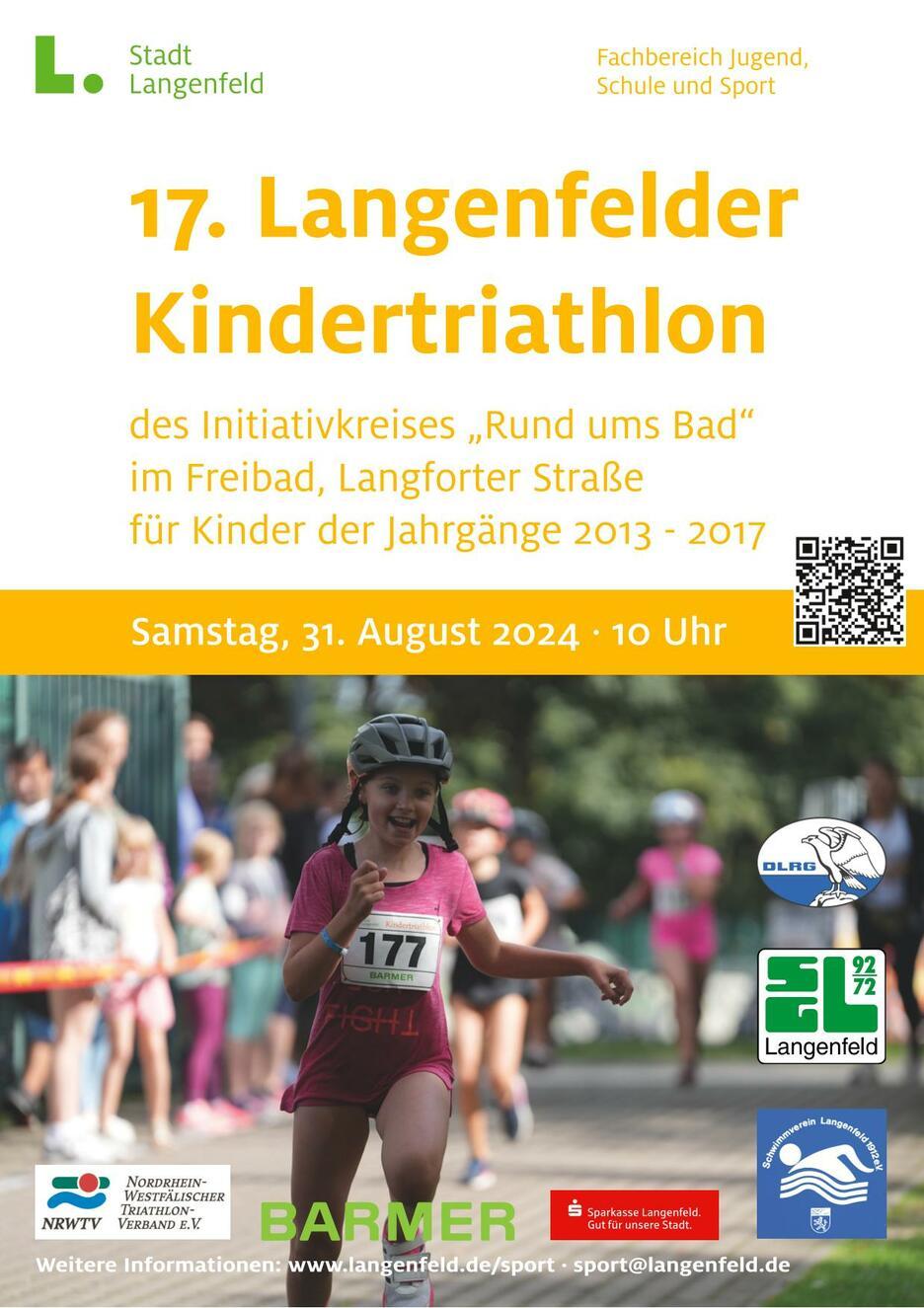 Das Referat Schule und Sport veranstaltet zusammen mit den Vereinen des Initiativkreises „Rund ums Bad“ (DLRG Ortsgruppe Langenfeld, Schwimmverein Langenfeld, SG Langenfeld und BSG Langenfeld) am Samstag, 31. August 2024, den 17. Langenfelder Kindertriathlon im und um das Langenfelder Freibad an der Langforter Straße.