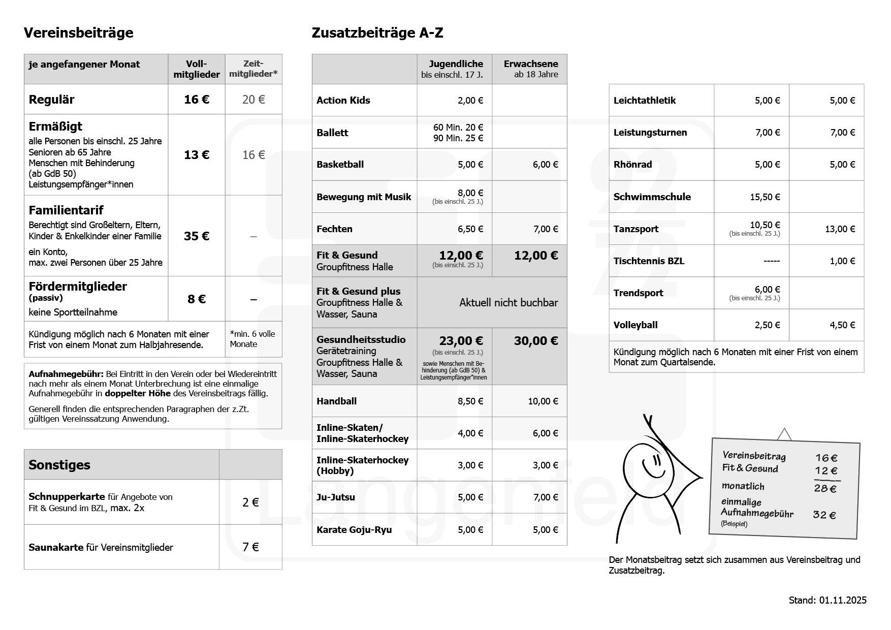 Bei Neuaufnahme in den Verein sowie bei Wiedereintritt nach mehr als einem Monat Unterbrechung wird einmalig eine Aufnahmegebühr in doppelter Höhe des Grundbeitrags erhoben.