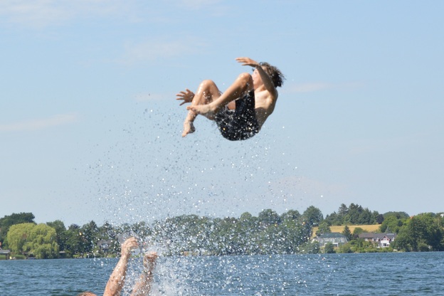 Der Stocksee gehört zu den saubersten Seen in ganz Schleswig-Holstein – und das sieht man auch! Unser eigener Strand mit Steg ist ein echtes Highlight. Das Beste: Von unserem Trampolin kannst du direkt ins Wasser hüpfen!