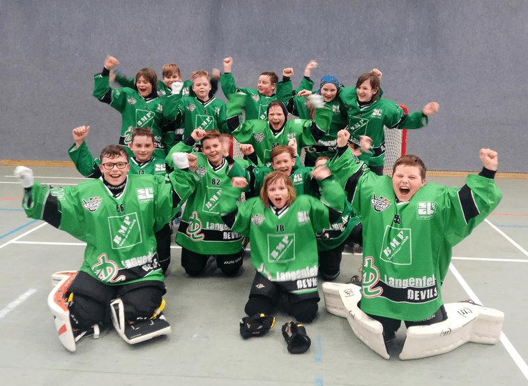 Am Sonntag fand das erste Spiel der Schüler 2 vor heimischer Kulisse statt. Die 12 Spieler*innen um das Trainerteam Sebastian Scheib und Tristan Höhn starteten mit einem hart erkämpften Sieg in die neue Saison. Nachdem die Partie im ersten Drittel torlos blieb, schien die Pause unseren Schülern gut getan zu haben: Die Trainer haben wohl die richtigen Worte gefunden. Direkt zu Beginn des 2. Drittels erzielte Juana Schmitz dank wunderbarer Vorarbeit von Isabella Kiencke das 1:0. Kurz danach fielen sowohl das erste Gegentor der Partie durch Kaarst und nur 25 Sekunden später unser Tor Nr. 2 durch David Lünenschloß (nach Pass von unserem Neuzugang Tom Stegbauer). Das Spiel blieb weiterhin spannend und unsere Teufel kämpften in einer tollen Mannschaftsleistung für das gemeinsame Ziel, den Sieg. Unterstützt wurden die jungen Teufel auf dem Feld durch ihre beiden Goalies (Finn Recha und Karl Schapegge), die durch super Leistungen dem Gegner das Tore schießen schwer machten. Gen Ende wurde es dann nochmal spannend, weil sowohl die Devils, erneut durch David Lünenschloß (Zuspiel Ole Kallenberg) als auch Kaarst jeweils in der 38. Minute ein weiteres Tor erzielten. Danach hielten die Teufel weiterhin zusammen und brachten das Spiel ohne weiteres Gegentor über die Zeit. Endstand also 3:2 für die Langenfeld DEVILS! Das Team wurde zum Ende des Spiels entsprechend frenetisch durch die Tribüne gefeiert. Wir freuen uns auf weitere solche Spiele! Let’s go DEVILS!