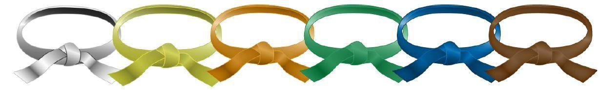 - gelb mit oranger Spitze = 5.1. Kyu (Zwischenprüfung)