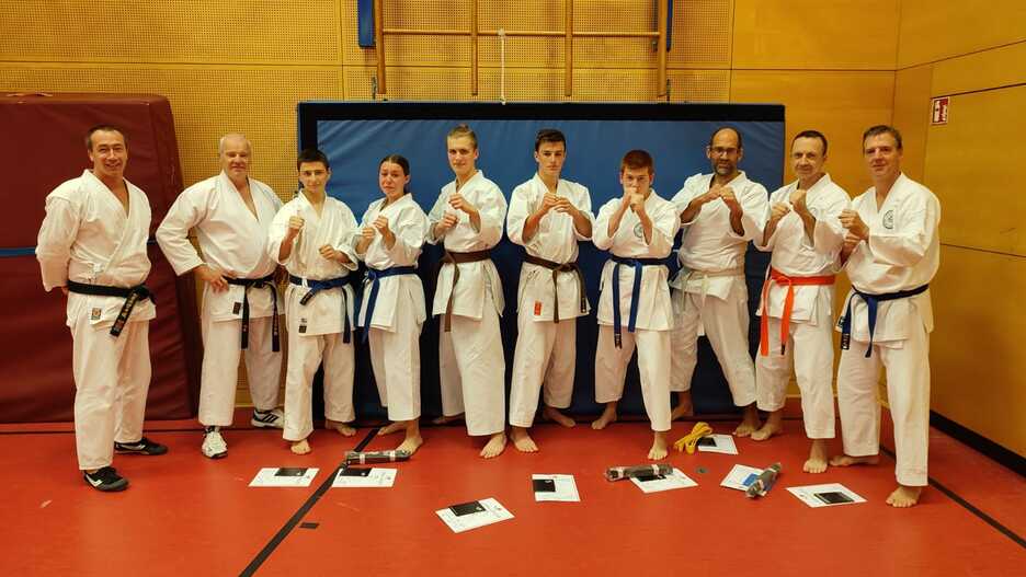 Die 8 Prüflinge stellten sich den strengen Augen von Michael Gans und seinem Beisitzer Lars Klein und meisterten alle geforderten Techniken zur vollsten Zufriedenheit ihrer Trainer. Aufgrund der aktuellen Lage wurden Partnerformen nur eingeschränkt geübt und vorgeführt.