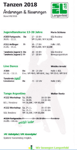 Wir weiten die Jugendangebote aus, bieten einen neuen Tanzkreis Line-Dance an und hoffen auf viele Teilnehmer im Herbst bei den Tango-Argentino Workshops.